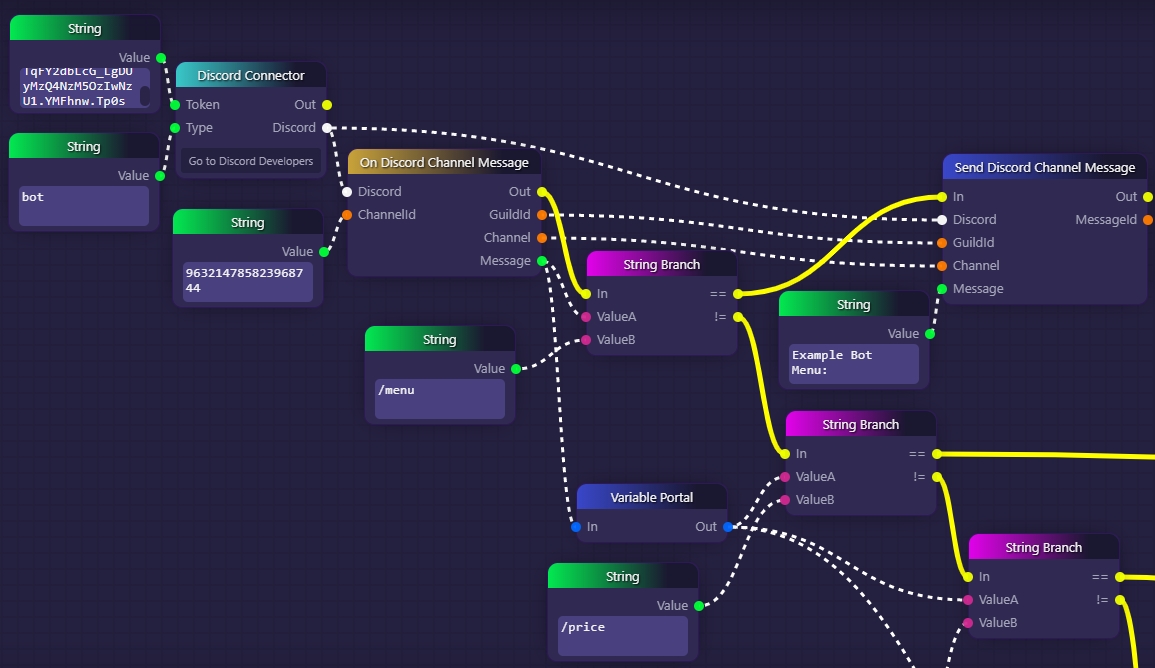 In the example above, we start by setting up a Discord API connection through a bot we control by passing our bot's token to a Discord Connector