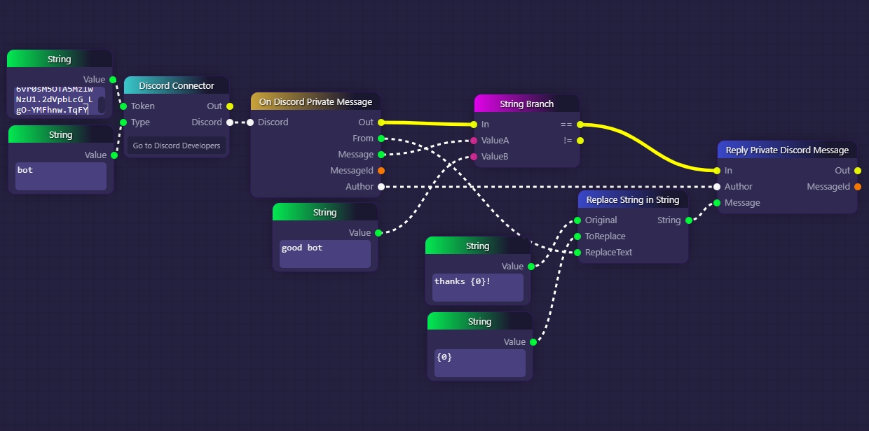 In the following example, whenever our Discord bot receives a private message, we detect it with our On Discord Private Message