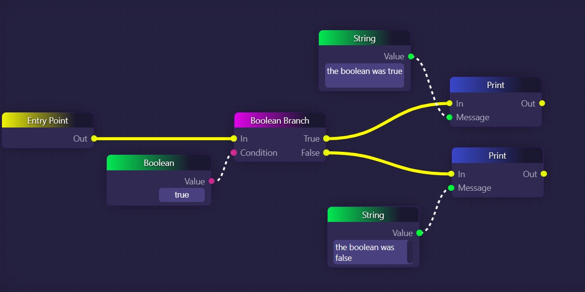 In the above example, "true" has been typed into the Boolean block, which is then being sent as the input data into the Boolean Branch block. When the Boolean Branchblock is run, it will trigger the top yellow connection to fire next, since that output corresponds with the "true" value it received as input. Therefore, the topmost Print block would execute, and we would see "the boolean was true" in our logs.