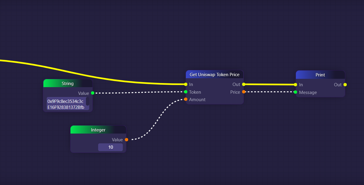 In the following graph snippet, we use an Integer block to enter the integer 10 as an input into the Get Uniswap Token Price block: