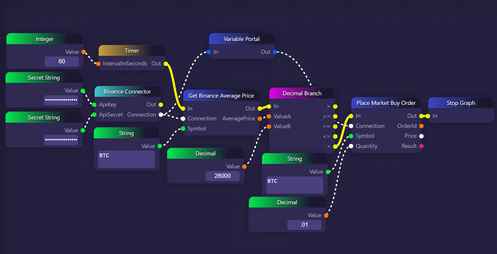 block to check if the price is below $28,000; if it is, we place a market buy order for 1% of a Bitcoin with a Place Market Buy Order