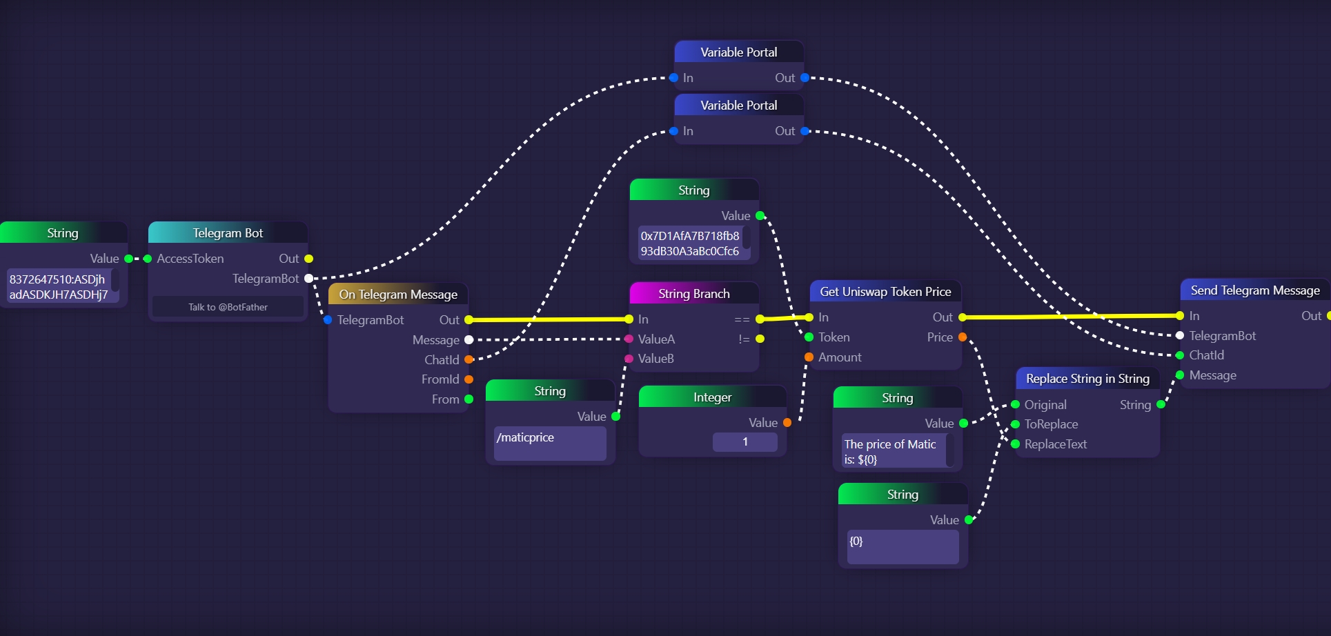 blocks, then, is simply to keep your graph visually organized, and to prevent your dotted-line connections from crossing through areas of your graph that are already complicated, making things more confusing to look at. The following graph uses a Telegram bot to listen for the command "/maticprice", and to respond with a message containing Matic's price in whatever channel it heard the command: