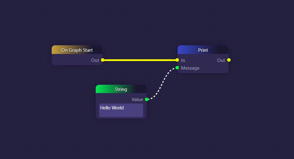 Simple "Hello World" Message: The simplest use of a "Print" block involves recording a message, such as "Hello World," into the logs at the beginning of the graph's execution. This helps in verifying that the graph has started successfully. The output message appears in the terminal at the bottom right of the IDE and is time-stamped for reference.