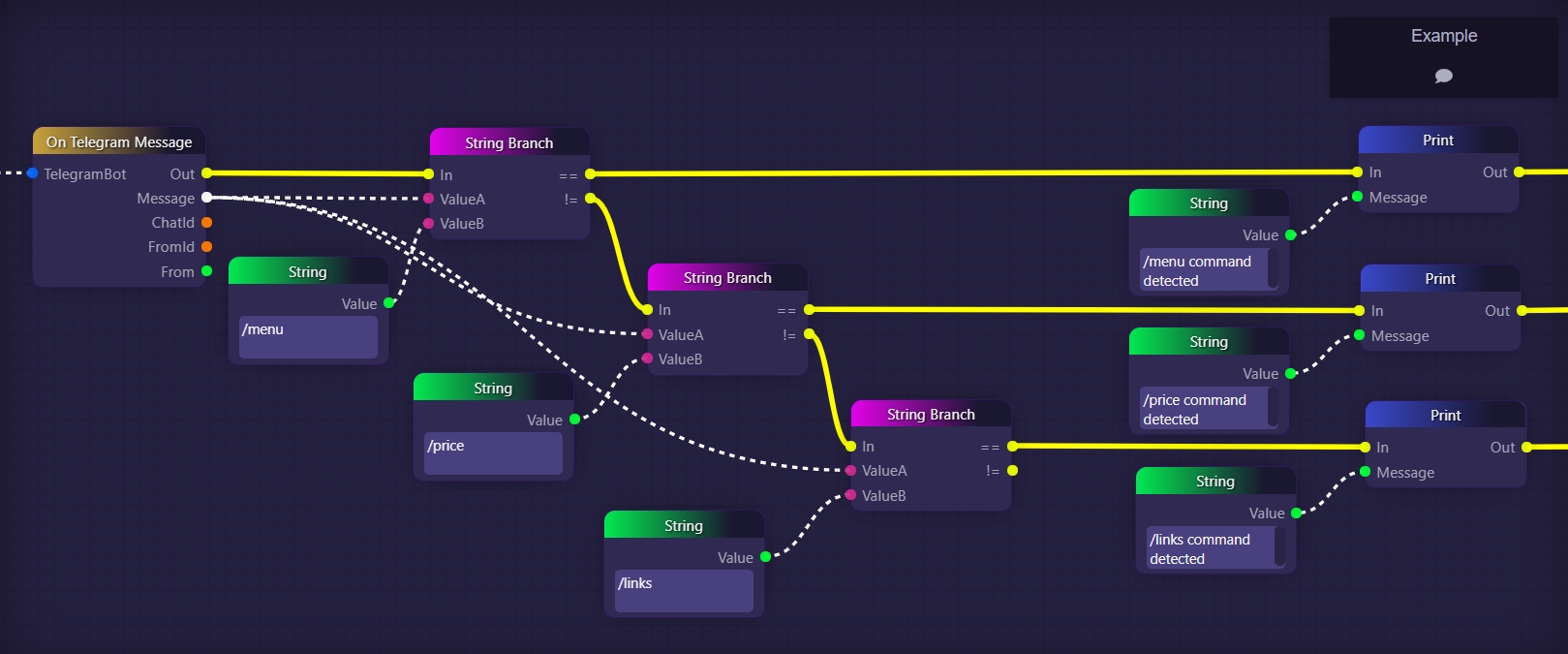 Recording Telegram Channel Commands: In a more complex scenario, "Print" blocks can be employed to record events when specific commands are detected in a Telegram channel. Using cascading "String Branch" blocks, messages submitted in the Telegram channel are checked to see if they match specific commands, such as "/menu", "/price", or "/links". Whenever these commands are detected, corresponding "Print" blocks are used to log messages in the graph's logs, indicating the commands' occurrences.