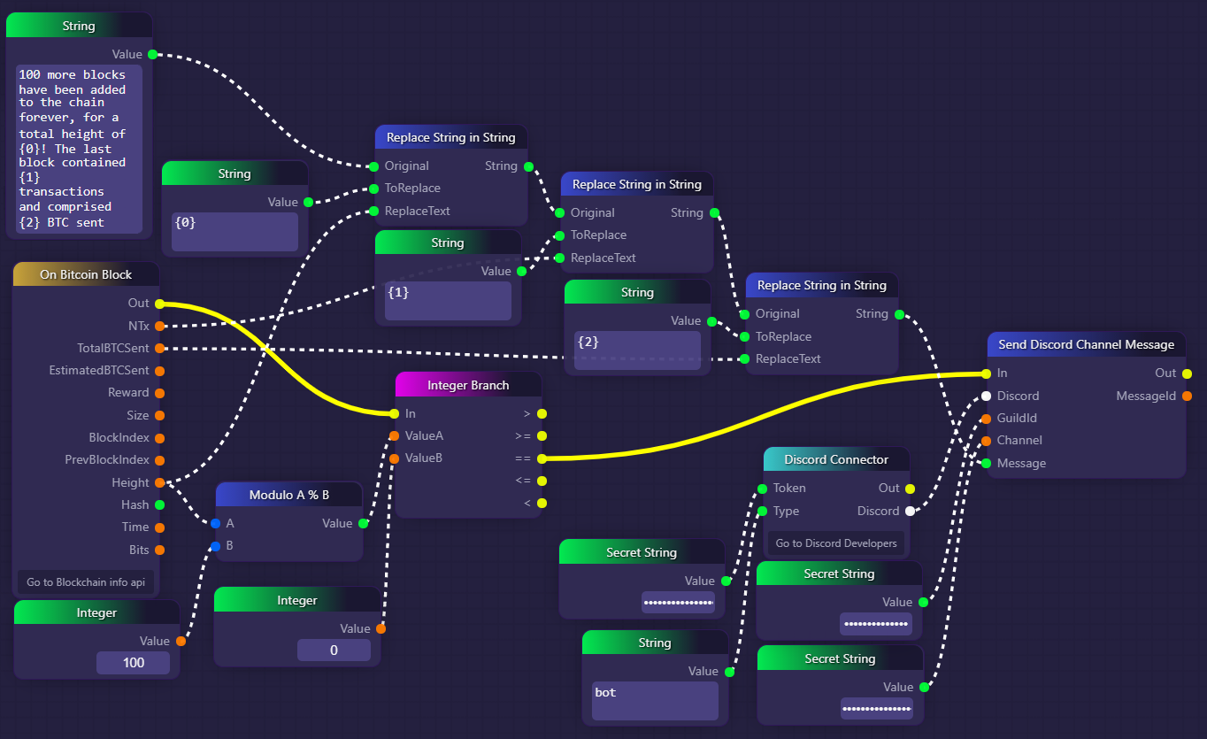 Whenever the block height does happen to be a multiple of 100, then we simply use a chain of Replace String In String blocks to build a message string containing the data we're interested in, and then send it to our Discord channel via some bot we control using a Send Discord Channel Message block.