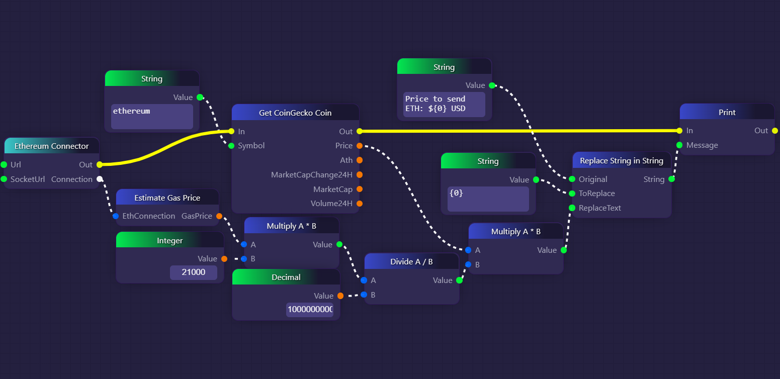 In our example, we simply calculate and then print the price of an Ether transaction one time, right when the graph starts running. It is easy to imagine a more developed and useful example in which this calculation is done whenever requested by users on some platform like Discord or Telegram.