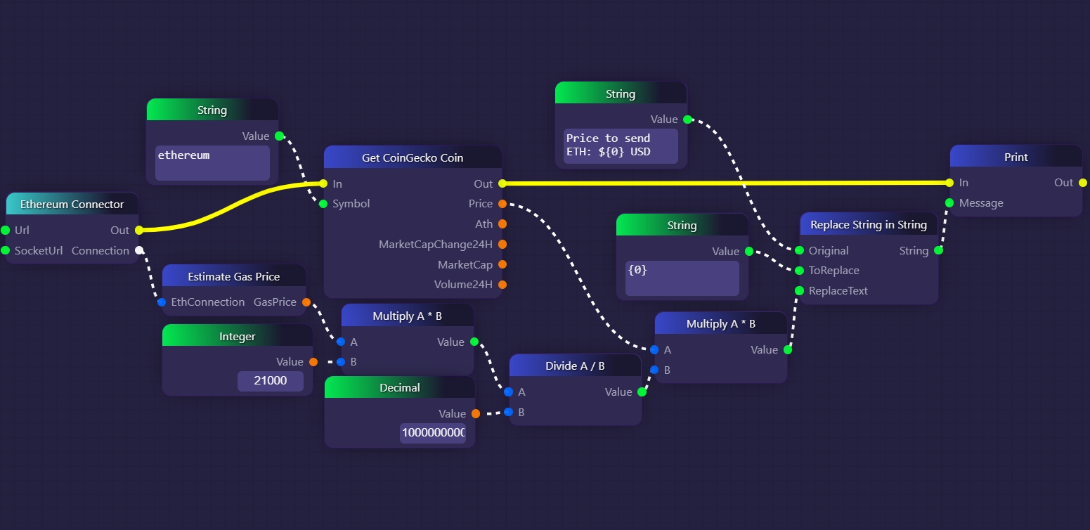 The calculation that this graph performs begins with the current price of gas in Gwei, given by the Estimate Gas Price block. Next, we use a Multiply A * B block to multiply this by 21,000, because that is how many units of gas it costs to do a simple ETH transaction. This gives of the cost of one ETH transaction in Gwei, but we want the cost of one transaction in USD. Gwei is a denomination of Ether, so we next use a Divide A / Bblock to divide our price in Gwei by one billion, which converts it into the same price denominated in Ether. Finally, we use a second Multiply A * B block to multiply this number by the current USD price of Ether as given by the Get CoinGecko Coin block, which gives us the current USD gas cost of a simple ETH transaction.