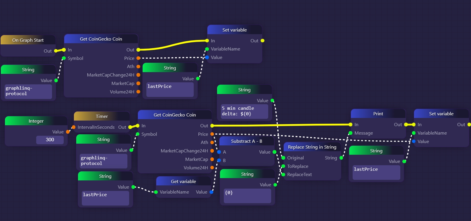 The rest of the graph is driven by a Timer block, which fires every 5 minutes (300 seconds). Whenever it fires, it calls a Get CoinGecko Coin block, which retrieves the current price of GLQ. This price is then passed to our Subtract A - B block, which substracts from it the price from 5 minutes before (stored in the variable "lastPrice"). The output of our Subtract A - B block is thus the 5-minute price delta of GLQ. We pack this into a short message using a Replace String In String block and then print it into the graph's log using a Print block. Finally, we use a Set variable block to assign the current price of GLQ to the variable "lastPrice", so that when the Timer block next fires in 5 minutes, that variable will contain the 5-minute-old price of GLQ.