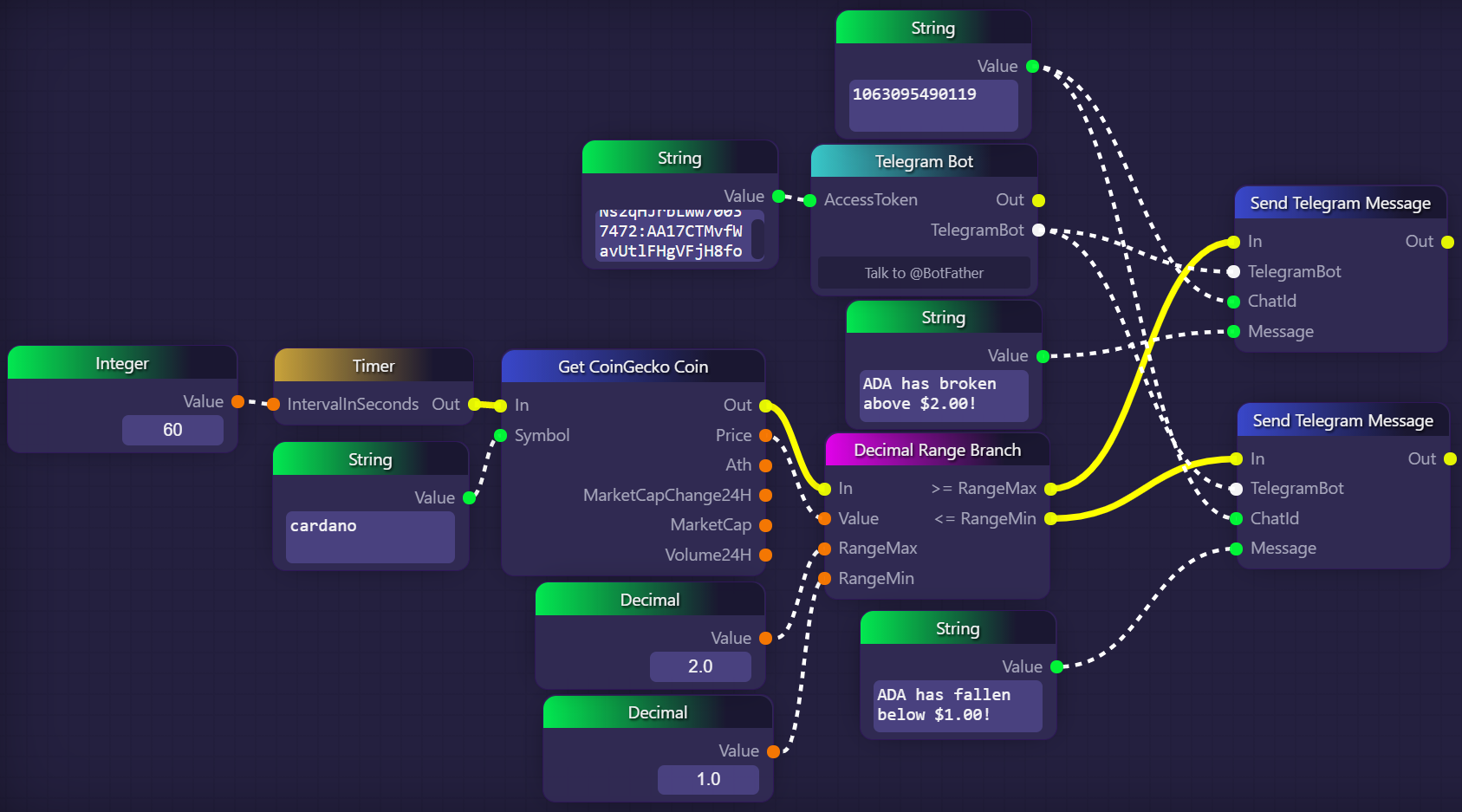 In the following example, we use a Decimal Range Branch block to send a message to a Telegram channel if the price of ADA goes above $2.00 or below $1.00: