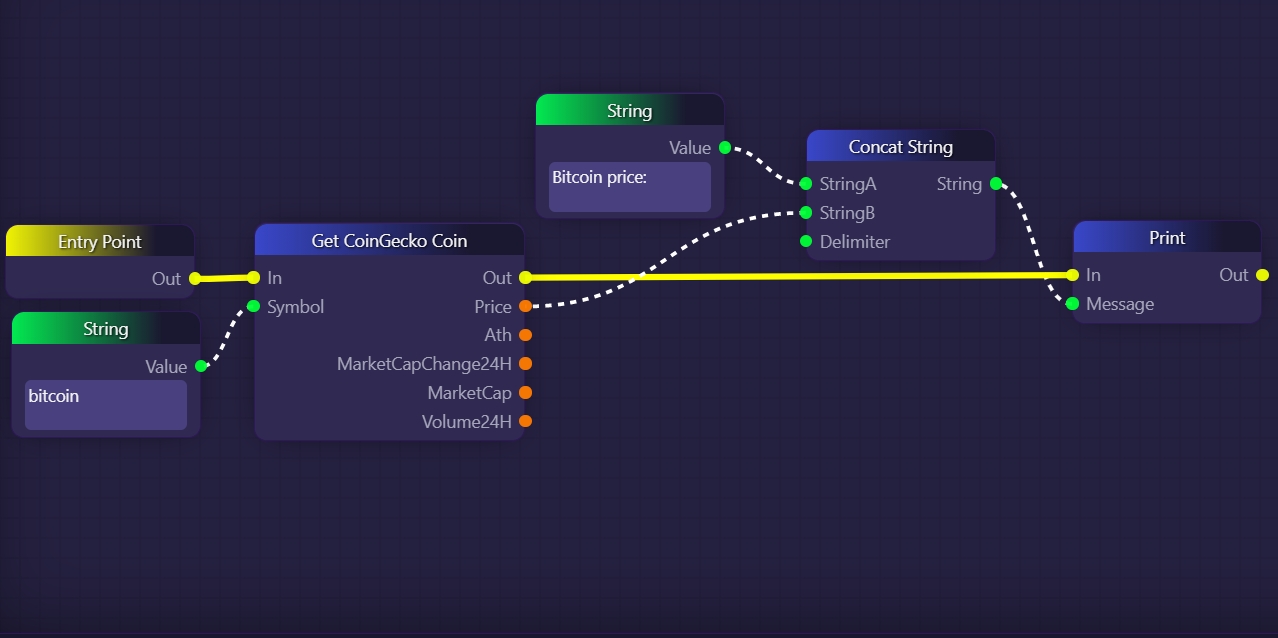 In the above example, we are looking up the price of Bitcoin on CoinGecko. Then, we are using a Concat String
