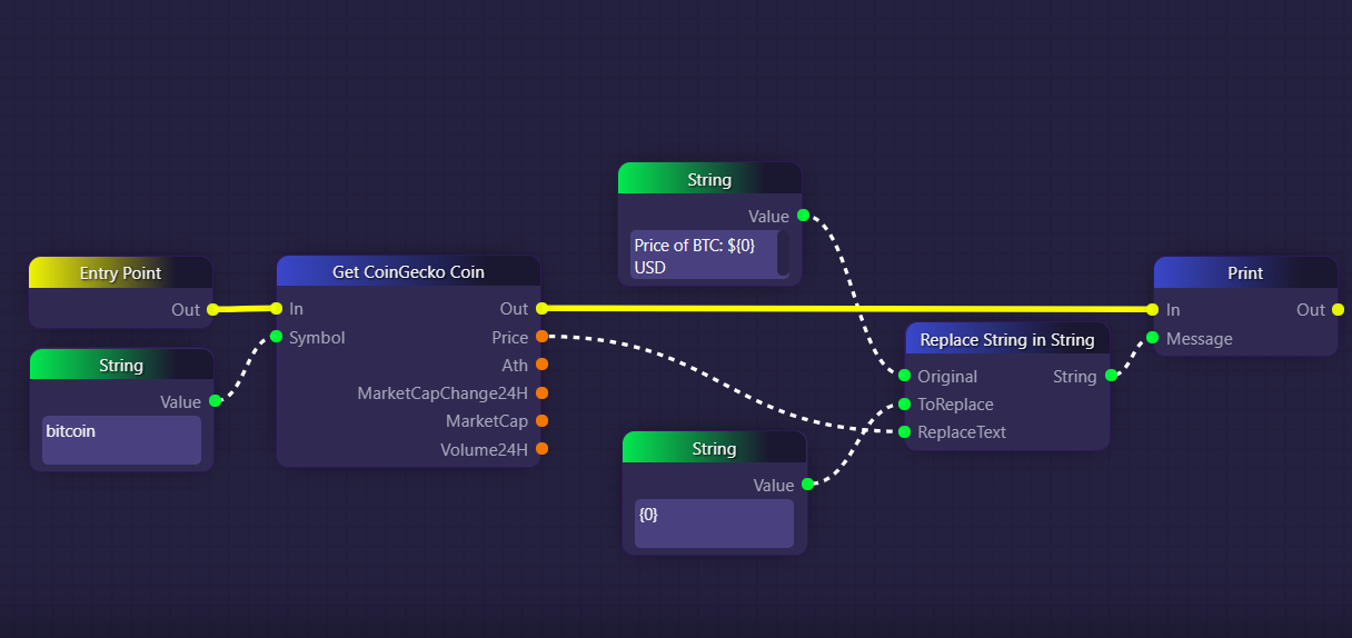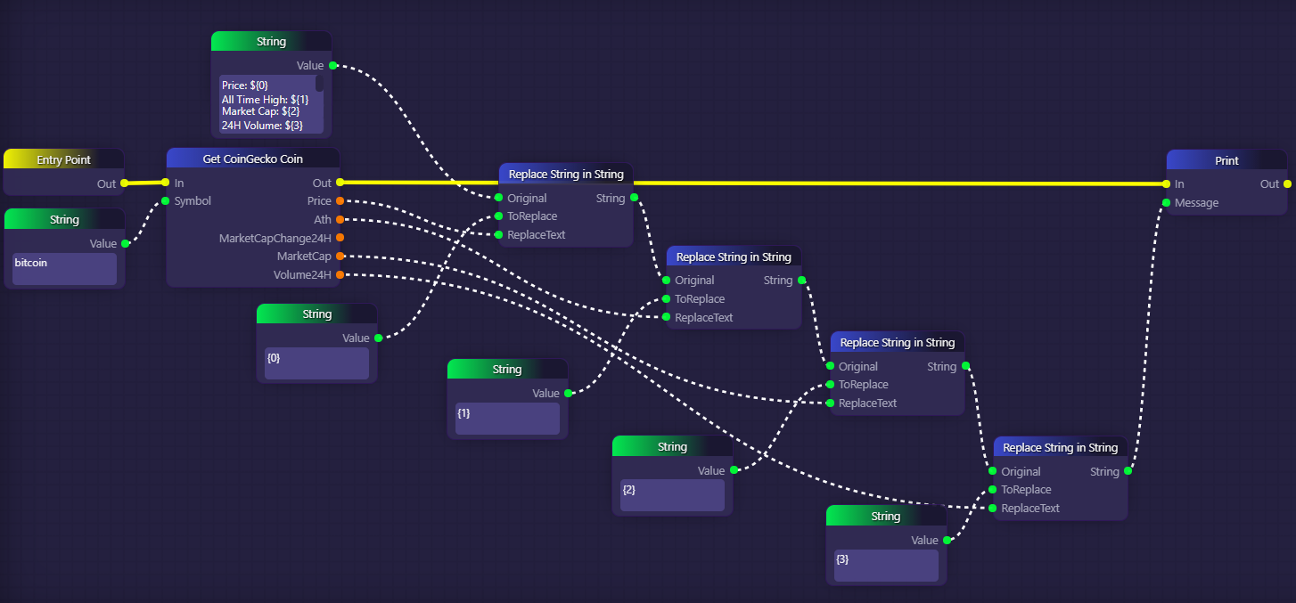 In the example above, we use the string "{0}" as a sort of placeholder in our original string. We then search for "{0}" using our Replace String in String block, and replace that string with whatever price is returned by the Get CoinGecko Coin block.