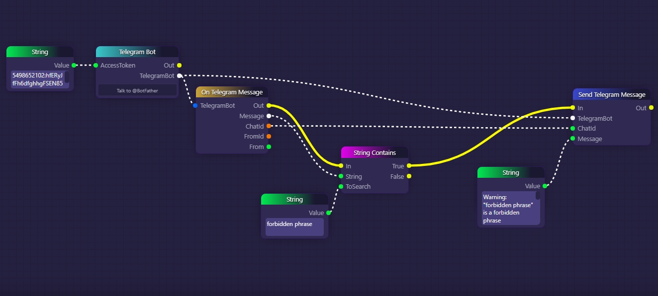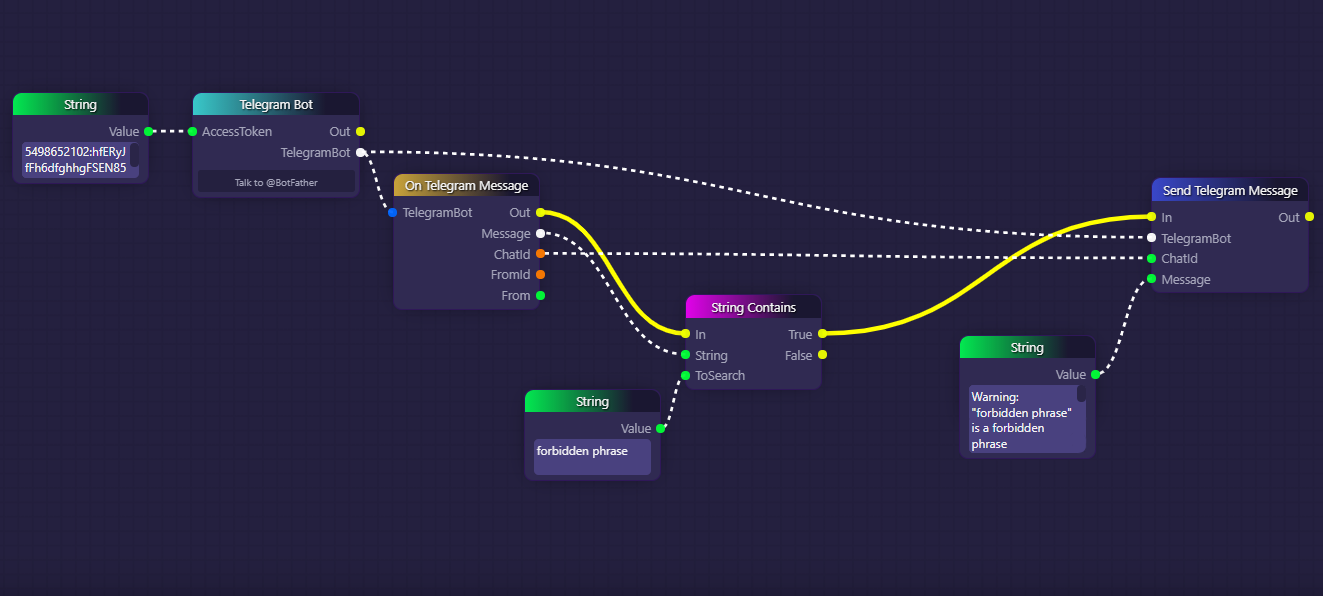 In the following example, we check every message that a Telegram bot hears to see if it contains the string "forbidden phrase". If it hears "forbidden phrase", it sends a warning message in the same Telegram channel that it heard the message in.