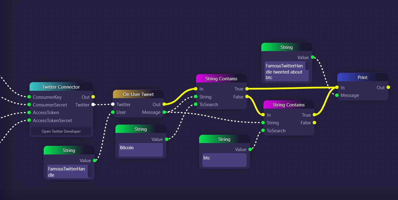 If the String Contains blocks detect either "Bitcoin" or "btc" (or "bitcoin" or "BTC"), then we print a message about it into the logs. Note that we could do something more interesting after detecting a phrase in a tweet, like send a message from a Discord bot, send ourselves an email or phone notification, or even deploy a buy or sell order on Binance.
